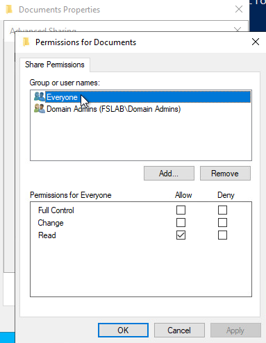 The Documents share has write access restricted to Domain Admins only. Regular users can read and browse, but can’t drop files into it.
