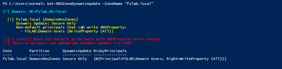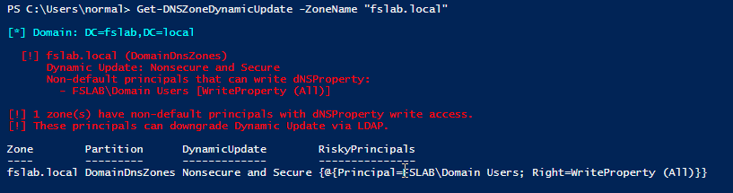 First, use Get-DNSZoneDynamicUpdate to check if the attacker’s principal can actually write to the DNS zone: