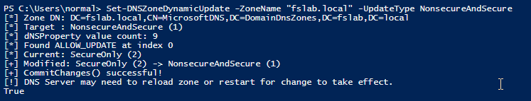 Set-DNSZoneDynamicUpdate -ZoneName "fslab.local" -UpdateType NonsecureAndSecure