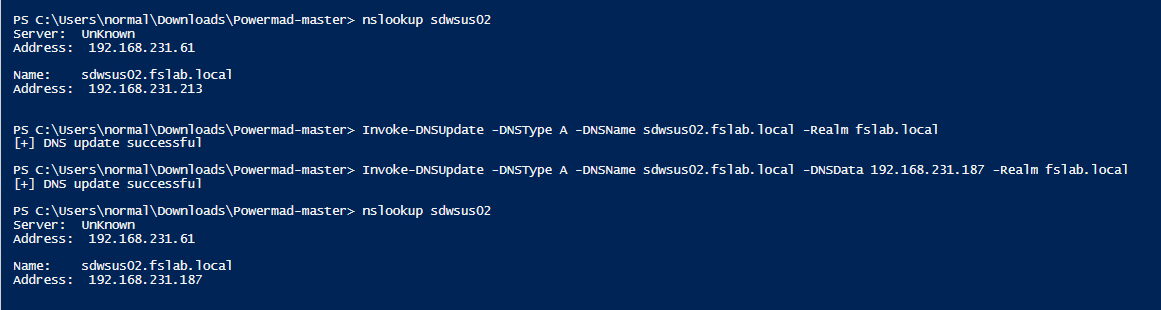 Invoke-DNSUpdate -DNSType A -DNSName sdwsus02.fslab.local -DNSData 192.168.231.187 -Realm fslab.local
