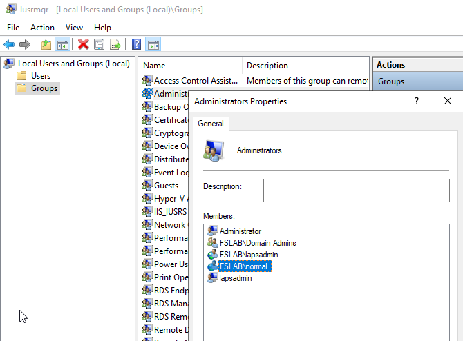 PsExec64.exe /accepteula /s powershell.exe "Add-LocalGroupMember -Group Administrators -Member fslab.local\normal;"